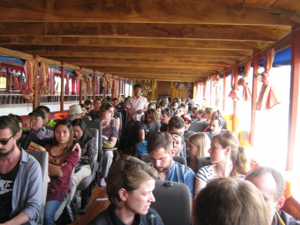 Heute früh ging es dann mit einem Slowboard voller anderer Touristen (vielleicht 150 ?) los nach Pakbeng, den Mehkong hinunter. Das war nicht spektakulär, aber schon ganz nett. Die Fahrt dauerte 7 Stunden. Es gibt noch eine weitere Etappe nach Luang Prabang, aber die werde ich nicht mitmachen. Mir hat ein Tag gereicht, muss ich sagen. Ich bin jetzt mit dem Boot auf dem Mehkong gefahren. Man schaut und schaut, und Laos auf der einen sowie Laos auf der anderen Seite ziehen langsam an einem vorüber. Es war recht frisch heute auf dem Mehkong.