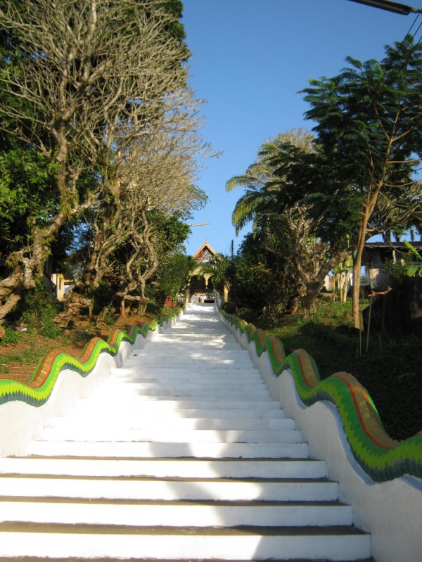 Der Ort hat natürlich nicht all zu viel zu bieten, aber man kriegt alles, was man braucht. Ein schönes Guesthouse, gutes Essen, entspanntes Laosfeeling, … der Tempel hier ist auch toll. So etwa in der Mitte des Ortes, an der Hauptstraße, geht eine Treppe hoch zum Tempel. Von da oben hat man einen tollen Blick über das Örtchen und auf den Mehkong.