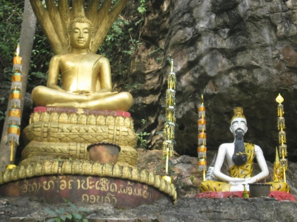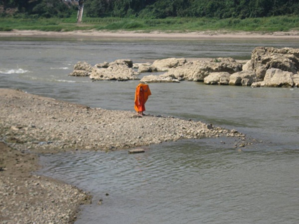 Luang Prabang liegt am Mehkong, dort, wo der Fluß Nam Khan in ihn hinein fließt. Dadurch entsteht eine recht überschaubare Halbinsel. Die Stadt ist wirklich wunderschön gelegen und trotz der vielen Touristen entspannt. Hier muss man wirklich nicht schreiend weglaufen, wie vielleicht aus Phuket oder Krabi. Es ist nur so, dass man hier viel Geld los wird. Viele der Tempel (Vats) erheben Eintrittsgeld, selbst die Bambusbrücke im Nordosten, die in die Dörfer dort führt, kostet Überquerungsgebühr (wenn auch gering). Ich habe ein recht günstiges Restaurant gefunden, wo das Essen „normal“ viel kostet, aber ansonsten zahlt man hier locker das Doppelte. Also, billiger als Thailand ist Laos jedenfalls nicht. Das kann man sagen. OK, ich setze meinen eigenen Lebensstil voraus, aber in Thailand wohne ich in der Regel gut für 12 Euro und esse morgens und abends jeweils für 1-2 Euro. Das schaffe ich hier in Schnitt wahrscheinlich nicht. Aber macht ja nichts.